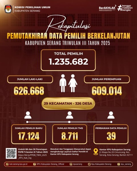 kab-serang.kpu.go.id - Berdasarkan Berita Acara Rapat Pleno Terbuka KPU Kabupaten Serang Nomor 34/PL.02.1-BA/3604/2025 Tanggal 2 Oktober 2025 tentang Rekapitulasi Daftar Pemilih Berkelanjutan Triwulan III Tingkat Kabupaten Serang Tahun 2025, di sampaikan hal - hal sebagai berikut.
