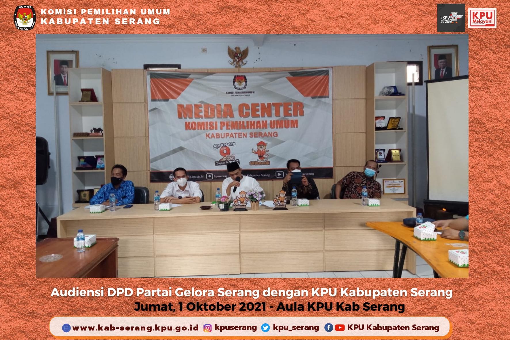 Pada Jumat, 1 Oktober 2021, KPU Kabupaten Serang menerima audiensi dari DPD Partai Gelora Serang. Adapun tujuan dari audiensi yang dilakukan yaitu Partai Gelora ingin memperkenalkan susunan kepengurusan DPD Partai Gelora Serang serta koordinasi mekanisme dan verifikasi partai politik baru dalam Pemilu yang akan datang.