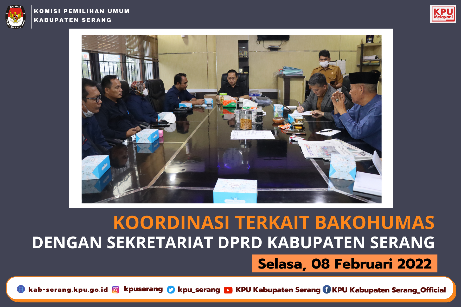 Serang (8/2) - Hari ini Selasa (8/2) KPU Kabupaten Serang melakukan koordinasi terkait Bakohumas dengan Sekretariat DPRD Kabupaten Serang. Hadir dalam koordinasi ini, Kordiv Sosdiklih Parmas dan SDM, Ibu Siti Maryam dan Kordiv Hukum dan Pengawasan, Bapak Zainal Muttaqin yang didampingi oleh Ade Wahyu Margono (Sekretaris) Agung Sukmana, (Kasubag Teknis dan Hupmas), Chotibul Umam (Kasubag Program dan Data) Sagara (Kasubag Hukum) serta staf pelaksana Dian Seputri.