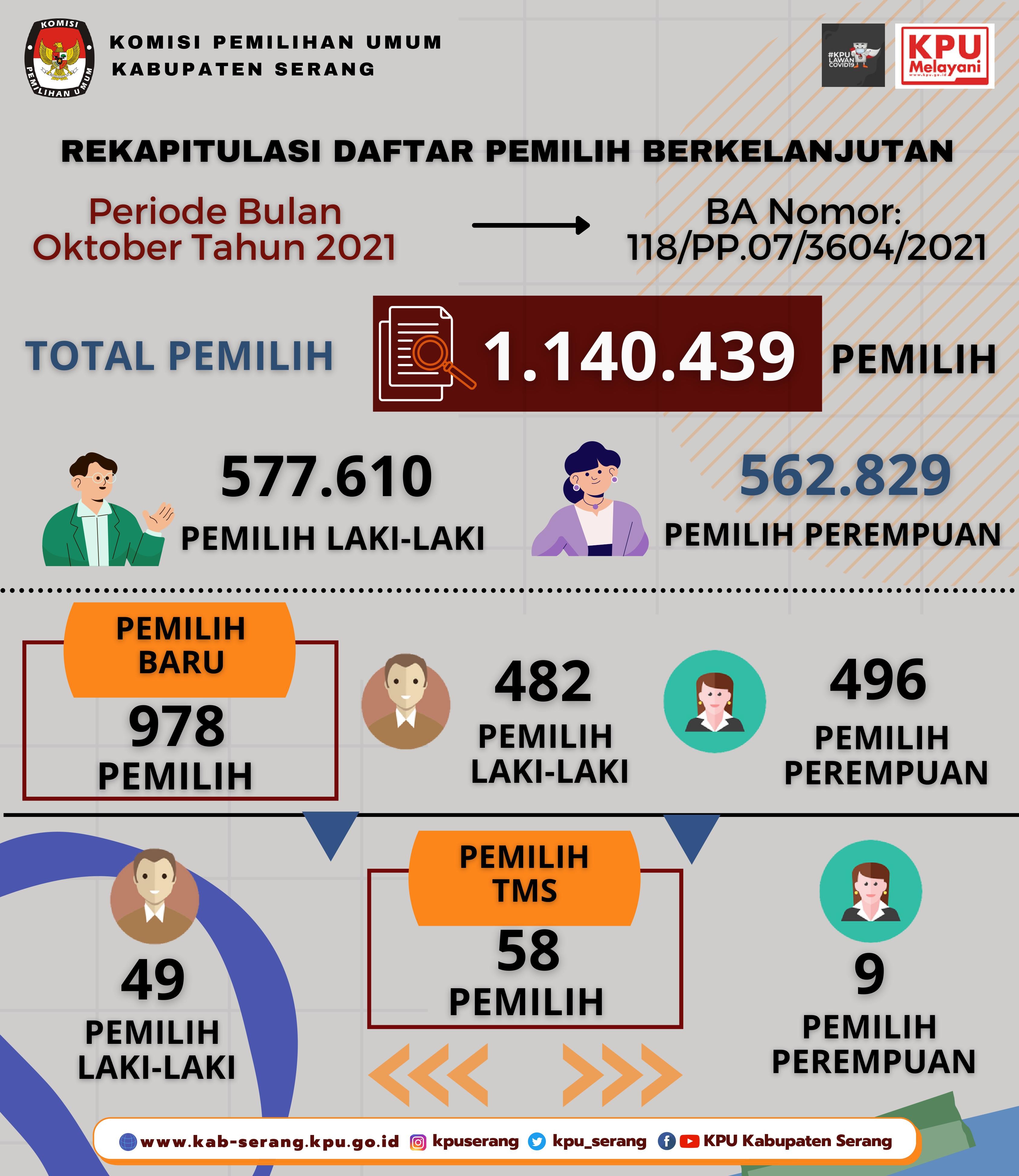 Berikut merupakan Rekapitulasi Daftar Pemilih Berkelanjutan (DPB) KPU Kabupaten Serang Periode Bulan Oktober 2021.