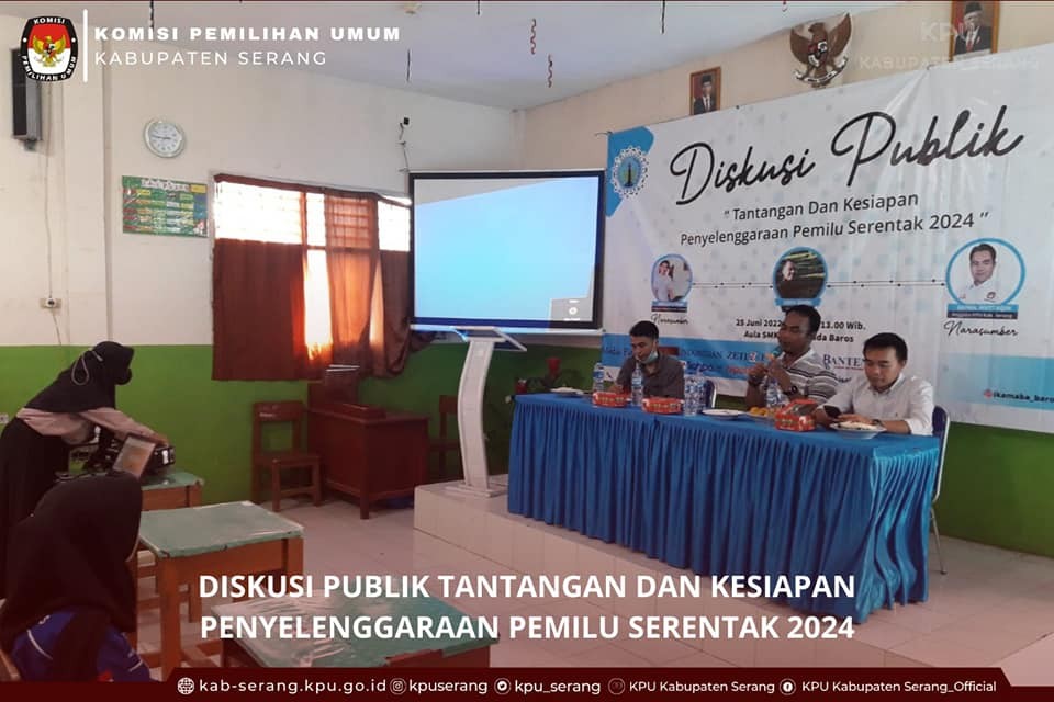 Serang (25/6) - Anggota KPU Kabupaten Serang Divisi Hukum dan Pengawasan, Bapak Zainal Muttaqin menjadi narasumber dalam Diskusi Publik bertempat di Aula SMK Nurul HUDA, Baros pada Sabtu (25/6). Tema yang diangkat pada diskusi ini adalah "Tantangan dan Kesiapan Penyelenggaraan Pemilu Serentak 2024". Dalam materi yang dipaparkan, Bapak Zainal menjelaskan mengenai kepemiluan, sejarah pemilu, hal yang enesial dalam pemilu, tahapan pemilu dsb. Selain itu, hadir narasumber lain yang bersala dari Bawaslu Kabupaten Serang, Bapak Abdurrohman. Tujuan agenda ini adalah untuk meningkatkan wawasan mengenai kepemiluan dan kesiapan pemilih dalam dalam Pemilu 2024 yang akan datang. Setelah pemberian materi selesai dilanjutkan dengan sesi diskusi antar peserta dan narasumber.
