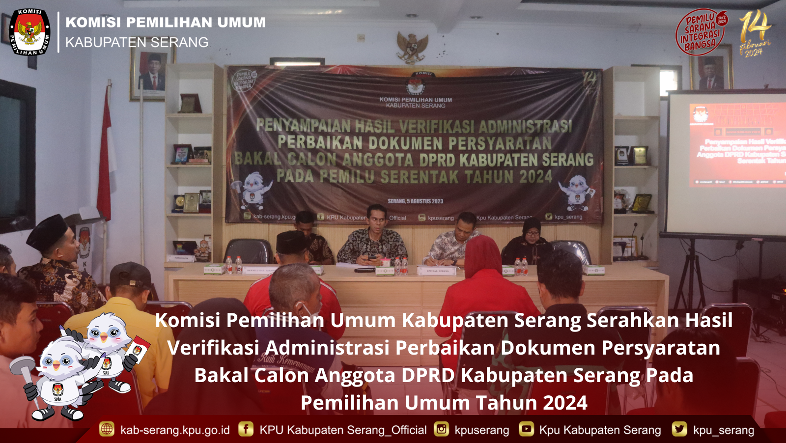 Komisi Pemilihan Umum Kabupaten Serang Serahkan Hasil Verifikasi Administrasi Perbaikan Dokumen Persyaratan Bakal Calon Anggota DPRD Kabupaten Serang Pada Pemilihan Umum Tahun 2024