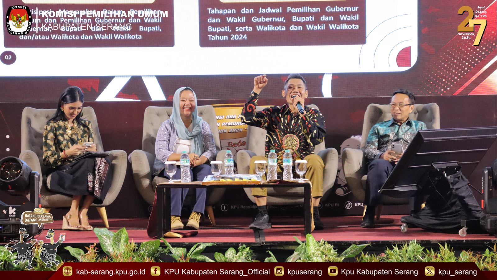Kegiatan berbentuk talk show itu dipandu oleh Tenaga Ahli KPU RI Nona Evita dengan menghadirkan beberapa narasumber. Eka Ernawati dari Divisi Reformasi Kebijakan Koalisi Perempuan Indonesia, Komisioner KPU Kabupaten Serang Ichsan Mahfudz, dan dosen UIN SMH Banten Syaeful Bahri