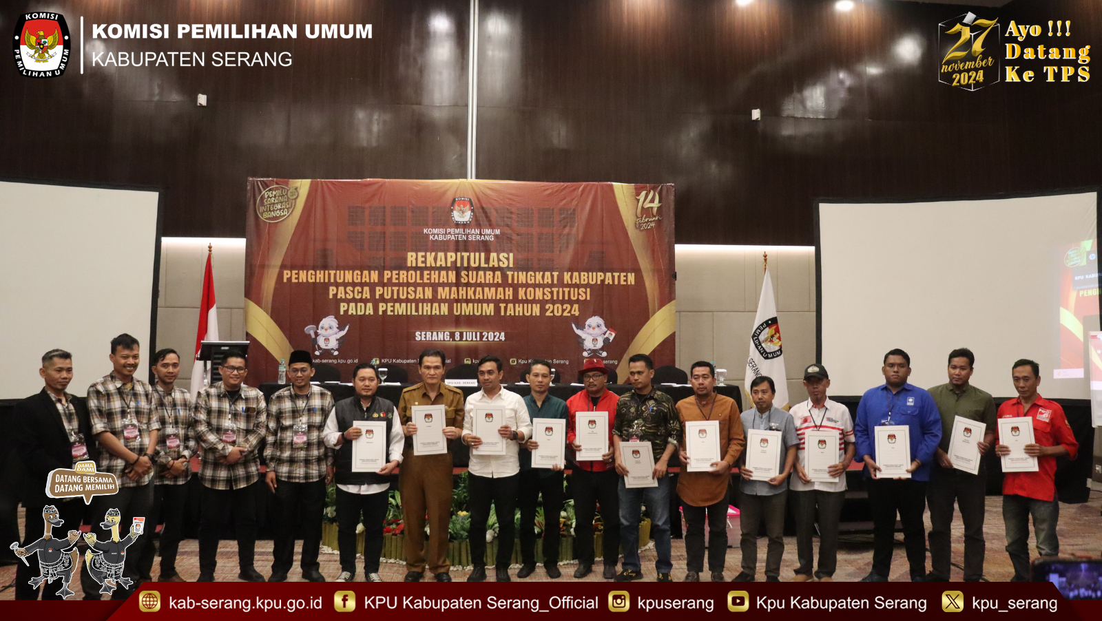 Serang - Komisi Pemilihan Umum Kabupaten Serang menggelar Rekapitulasi Penghitungan Perolehan Suara Tingkat Kabupaten Pasca Putusan Mahkamah Konstitusi Pada Pemilihan Umum Tahun 2024 di Swissbelinn Modern Cikande Serang Pada Senin, 8 Juli 2024.