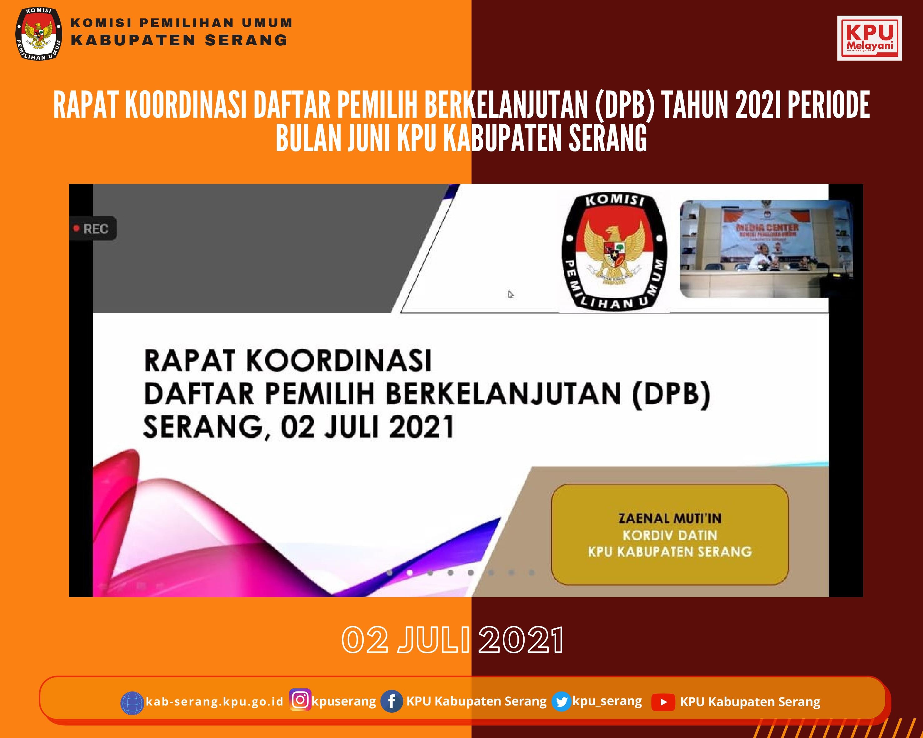 Serang, – Komisi Pemilihan Umum Kabupaten Serang pada tanggal 02 Juli 2021 telah melaksanakan Rapat Koordinasi Pemutakhiran Data Pemilih Berkelanjutan Periode Juni dengan mengundang Stakeholder dan pihak terkait hal ini dilakukan berpedoman pada Surat Dinas Ketua KPU RI Nomor 366/PL.02-SD/01/KPU/IV/2021 tanggal 21 April 2021 perihal Perubahan Surat KPU RI Nomor 132/PL.02-SD/01/KPU/II/2021 perihal Pemutakhiran Data Pemilih Berkelanjutan Tahun 2021 dalam Rapat Koordinasi ini ada beberapa hal yang perlu disampaikan :