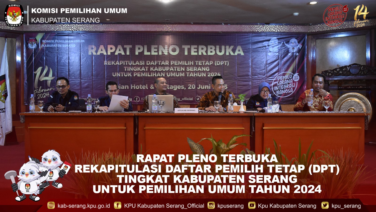 Rapat pleno dibuka oleh Ketua KPU Kabupaten Serang Bapak Abidin Nasyar, kemudian pemaparan proses Rekapitulasi DPT oleh seluruh Anggota KPU Kabupaten Serang Secara bergiliran yang di awali oleh Ketua Divisi Perencanaan Data dan Informasi KPU Kabupaten Serang Bapak Zaenal Muti’in. Kemudian ditutup dengan Penandatanganan Berita Acara Penetapan Daftar Pemilih Tetap (DPT) KPU Kabupaten Serang.