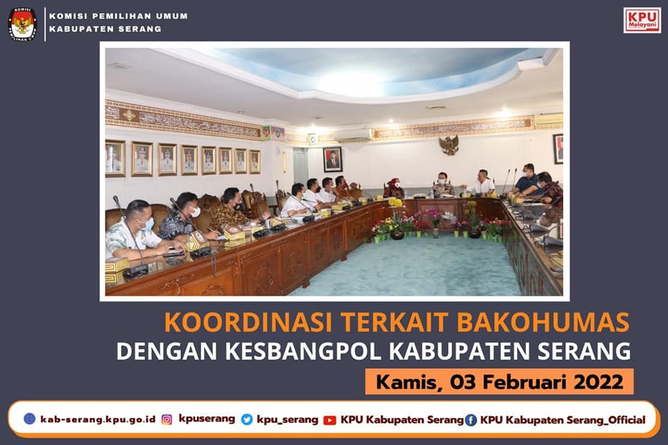 Serang (3/2) - KPU Kabupaten Serang melakukan koordinasi ke-3 terkait Bakohumas dengan Badan Kesbangpol Kabupaten Serang pada Kamis (3/2). Hadir dalam koordinasi ini, Ketua KPU Kabupaten Serang, Bapak Abidin Nasyar, Kordiv Sosdiklih Parmas dan SDM, Ibu Siti Maryam dan Kordiv Hukum dan Pengawasan, Bapak Zainal Muttaqin yang didampingi oleh Ade Wahyu Margono (Sekretaris) Agung Sukmana, (Kasubag Teknis dan Hupmas), Chotibul Umam (Kasubag Program dan Data) serta staf pelaksana Dian Seputri. Kedatangan KPU Kabupaten Serang disambut oleh Kepala Badan Kesbangpol Kabupaten Serang (Epi Priatna, S.Sos.,M.Si), Kabid Poldagri dan Ormas (M.Yagi Susilo, S.H.,M.Si), Analis Kebijakan Muda (Dikdik Abdul Hamid, S.IP.,M.Si), Husein (Kasubid Ormas) dan Staf (Agung Sandayu, Ios Rosyadi).