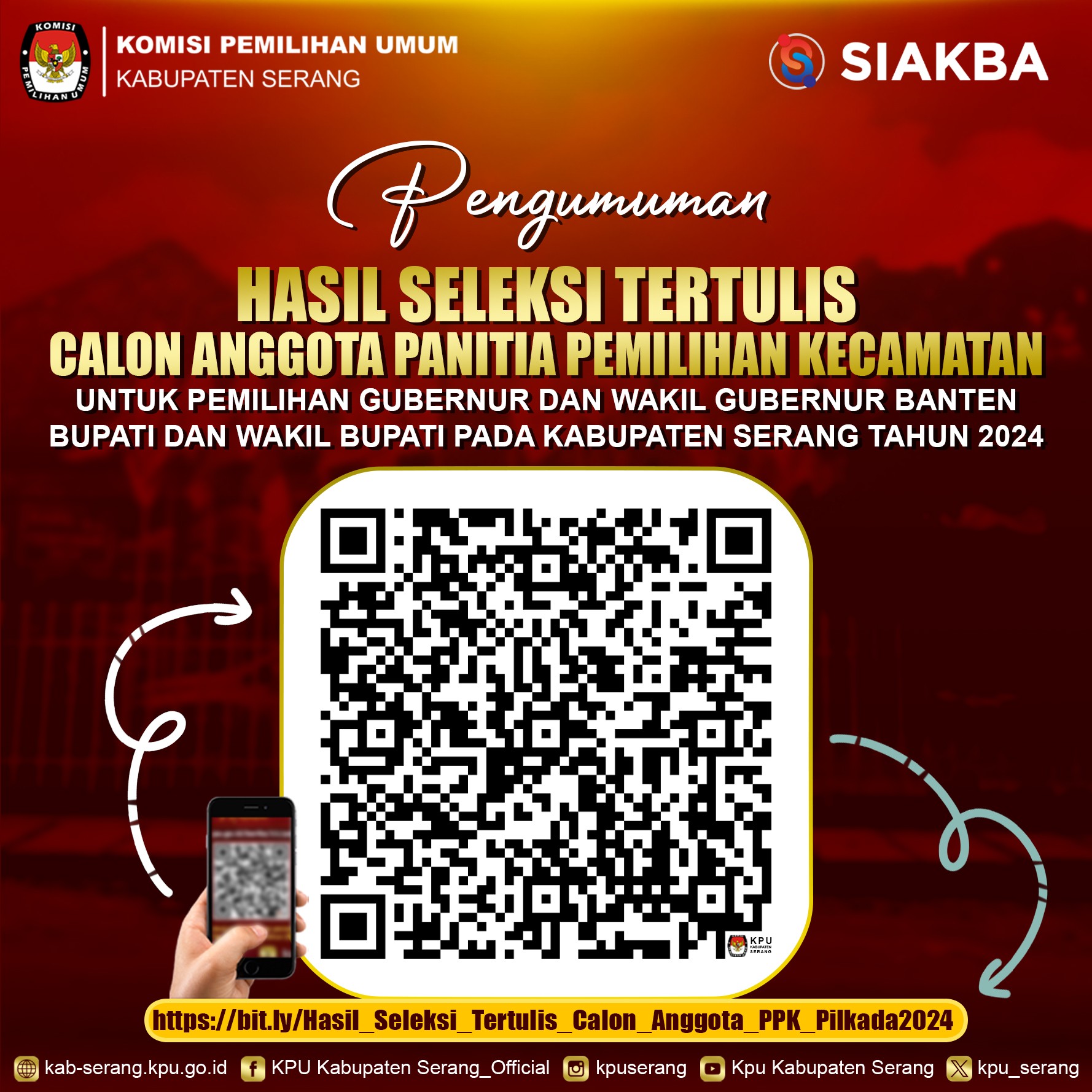 - KPU Kabupaten Serang Menetapkan Hasil Seleksi Tertulis Calon Panitia Pemilihan Kecamatan untuk Pemilihan Gubernur dan Wakil Gubernur, Bupati dan Wakil Bupati Tahun 2024 sebagaimana daftar terlampir;