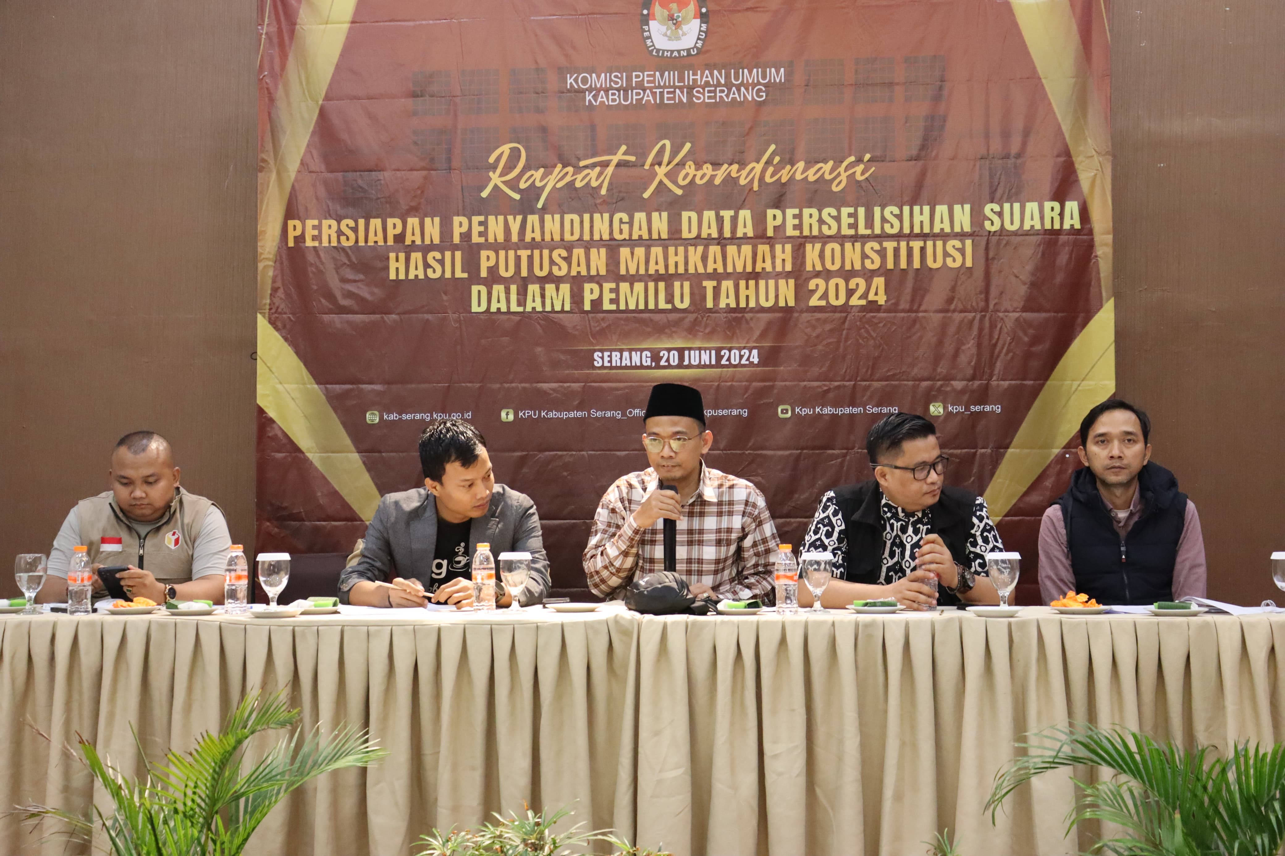 Serang, kab-serang.kpu.go.id - Komisi Pemilihan Umum Kabupaten Serang Menggelar Rapat Koordinasi Persiapan Pelaksanaan Penyandingan Data Perolehan Suara Pasca Putusan Mahkamah Konstitusi Pada Pemilu 2024 di Horison TC UPI Serang, Kamis (20 Juni 2024)