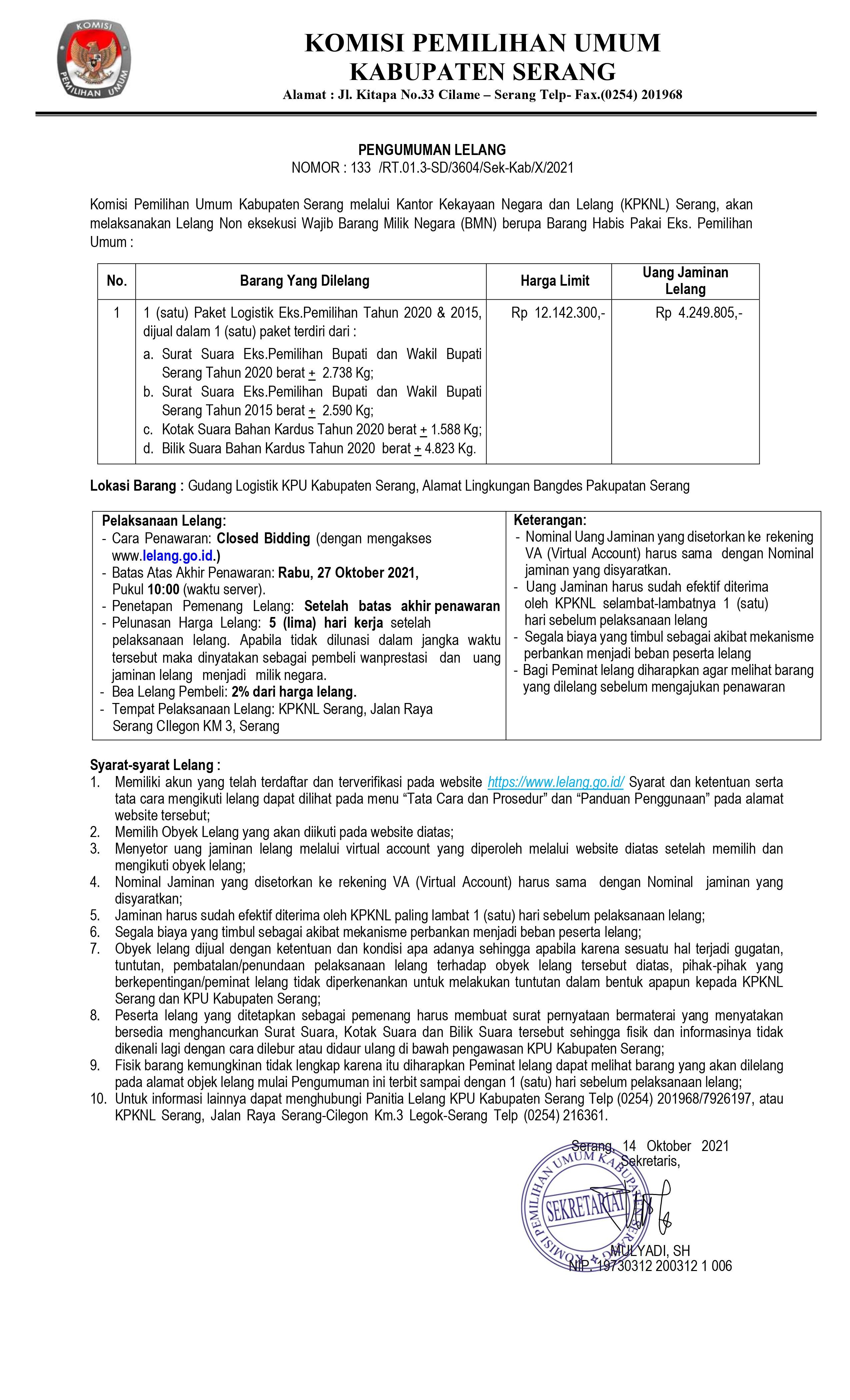 Komisi Pemilihan Umum Kabupaten Serang melalui Kantor Kekayaan Negara dan Lelang (KPKNL) Serang, akan melaksanakan Lelang Non eksekusi Wajib Barang Milik Negara (BMN) berupa Barang Habis Pakai Eks. Pemilihan Umum.