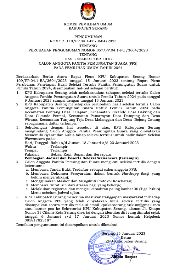 Berdasarkan Berita Acara Rapat Pleno KPU Kabupaten Serang Nomor 109/PP.04.1-BA/3604/2023 tanggal 15 Januari 2023 tentang Rapat Pleno Perubahan Penetapan Hasil Seleksi Tertulis Panitia Pemungutan Suara untuk Pemilu Tahun 2024, disampaikan hal-hal sebagai berikut: