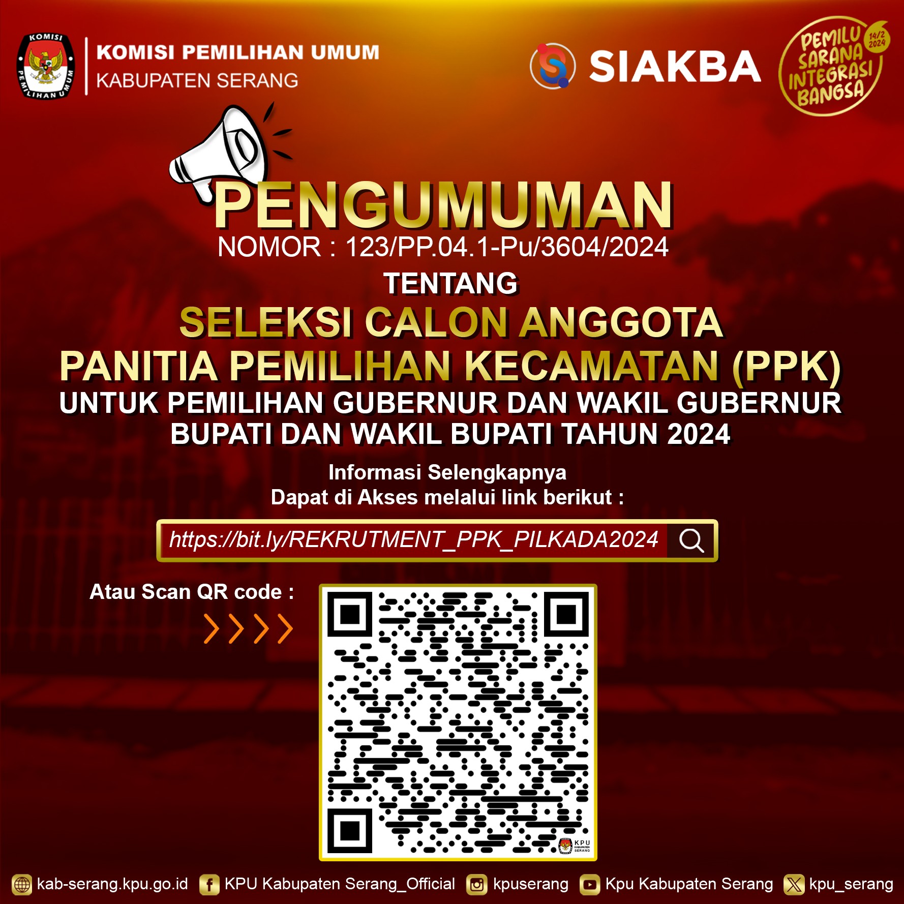 Serang, kab-serang.kpu.go.id/ - Pengumuman Nomor 123/PP.04.1-Pu/3604/2024 tentang Seleksi Calon Anggota Panitia Pemilihan Kecamatan (PPK) untuk Pemilihan Gubernur dan Wakil Gubernur, Bupati dan Wakil Bupati Tahun 2024.