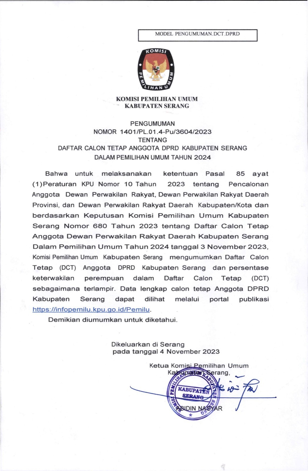 PENGUMUMAN NOMOR 1401/PL.01.4-Pu/3604/2023 TENTANG DAFTAR CALON TETAP ANGGOTA DPRD KABUPATEN SERANG DALAM PEMILIHAN UMUM TAHUN 2024