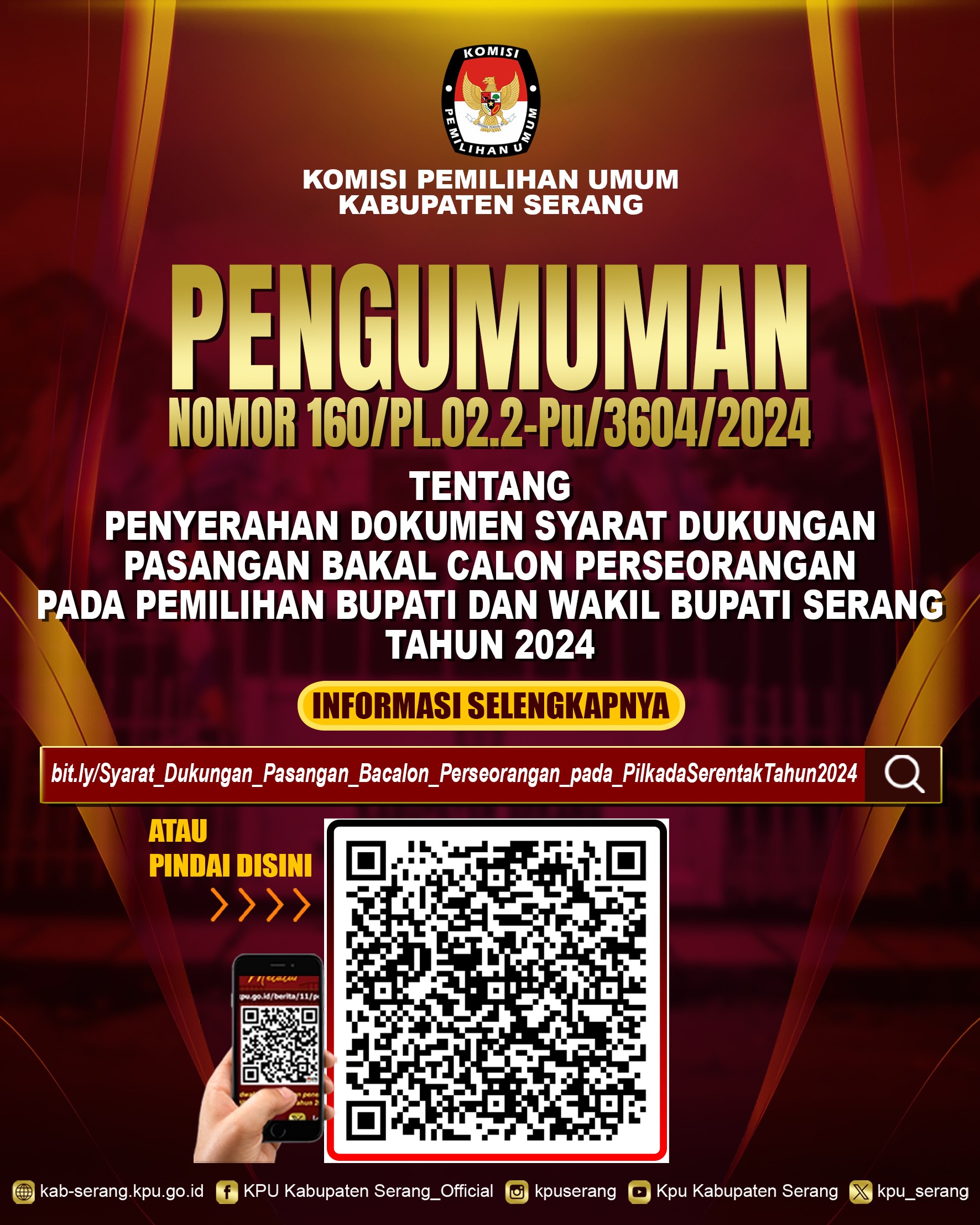 PENGUMUMAN NOMOR : 160/PL.02.2-Pu/3604/2024 TENTANG PENYERAHAN DOKUMEN SYARAT DUKUNGAN PASANGAN BAKAL CALON PERSEORANGAN PADA PEMILIHAN BUPATI DAN WAKIL BUPATI SERANG TAHUN 2024