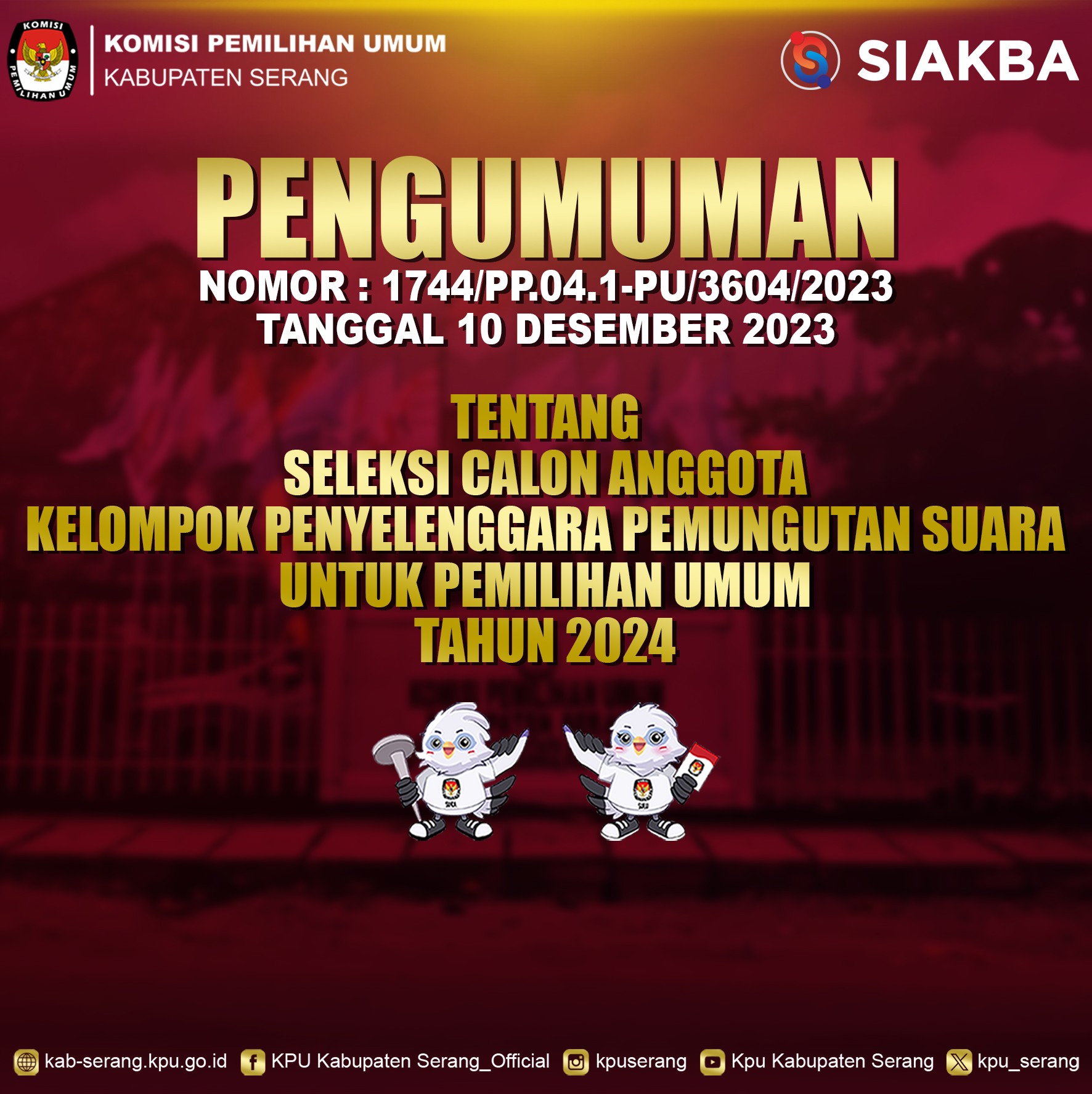 PENGUMUMAN NOMOR: 1744/PP.04.1-PU/3604/2023 TENTANG SELEKSI CALON ANGGOTA KELOMPOK PENYELENGGARA PEMUNGUTAN SUARA UNTUK PEMILIHAN UMUM TAHUN 2024