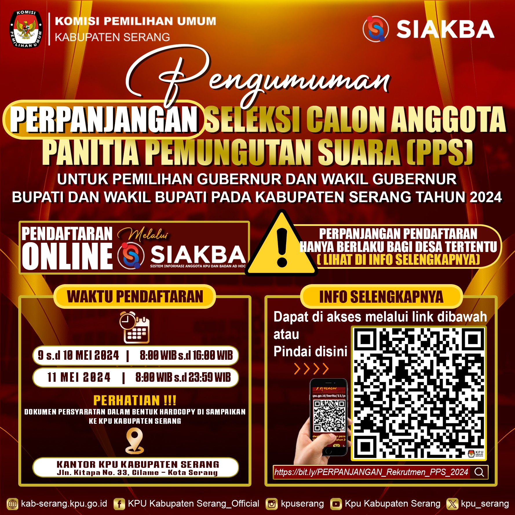 Serang, kab-serang.kpu.go.id - Pengumuman Nomor 179/PP.04.1-Pu/3604/2024 tentang Perpanjangan Pendaftaran Seleksi Calon Anggota Panitia Pemungutan Suara (PPS) untuk Pemilihan Gubernur dan Wakil Gubernur, Bupati dan Wakil Bupati Tahun 2024.