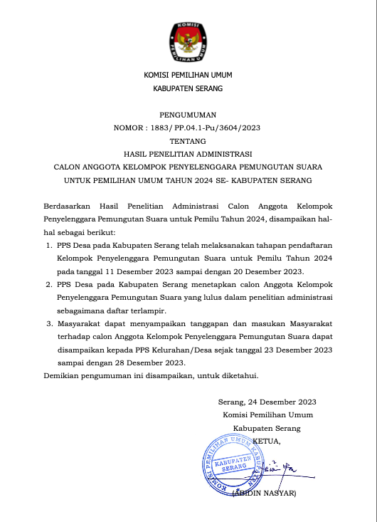 PENGUMUMAN NOMOR : 1883/ PP.04.1-Pu/3604/2023 TENTANG HASIL PENELITIAN ADMINISTRASI CALON ANGGOTA KELOMPOK PENYELENGGARA PEMUNGUTAN SUARA UNTUK PEMILIHAN UMUM TAHUN 2024 SE- KABUPATEN SERANG