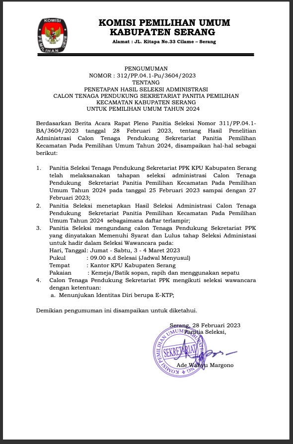 Panitia Seleksi Tenaga Pendukung Sekretariat PPK KPU Kabupaten Serang telah melaksanakan tahapan seleksi administrasi Calon Tenaga Pendukung Sekretariat Panitia Pemilihan Kecamatan Pada Pemilihan Umum Tahun 2024 pada tanggal 25 Februari 2023 sampai dengan 27 Februari 2023;