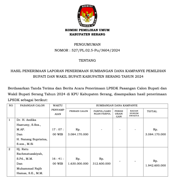 kab-serang.kpu.go.id - Berdasarkan Tanda Terima dan Berita Acara Penerimaan LPSDK Pasangan Calon Bupati dan Wakil Bupati Serang Tahun 2024 di KPU Kabupaten Serang, disampaikan hasil penerimaan LPSDK sebagai berikut: