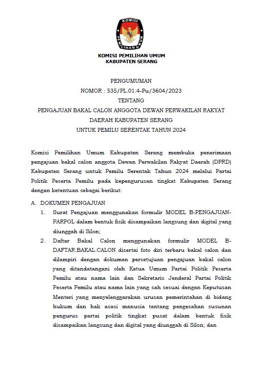 PENGUMUMAN NOMOR : 535/PL.01.4-Pu/3604/2023 TENTANG PENGAJUAN BAKAL CALON ANGGOTA DEWAN PERWAKILAN RAKYAT DAERAH KABUPATEN SERANG UNTUK PEMILU SERENTAK TAHUN 2024