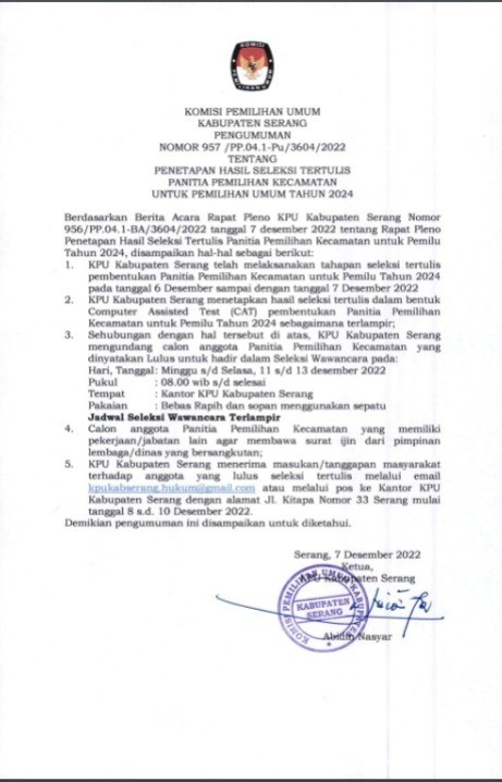 Berdasarkan Berita Acara Rapat Pleno KPU Kabupaten Serang Nomor 956/PP.04.1-BA/3604/2022 tanggal 7 desember 2022 tentang Rapat Pleno Penetapan Hasil Seleksi Tertulis Panitia Pemilihan Kecamatan untuk Pemilu Tahun 2024, disampaikan hal-hal sebagai berikut: