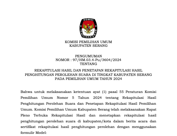 PENGUMUMAN NOMOR : 97/HM.03.4-Pu/3604/2024 TENTANG REKAPITULASI HASIL DAN PENETAPAN REKAPITULASI HASIL PENGHITUNGAN PEROLEHAN SUARA DI TINGKAT KABUPATEN SERANG PADA PEMILIHAN UMUM TAHUN 2024