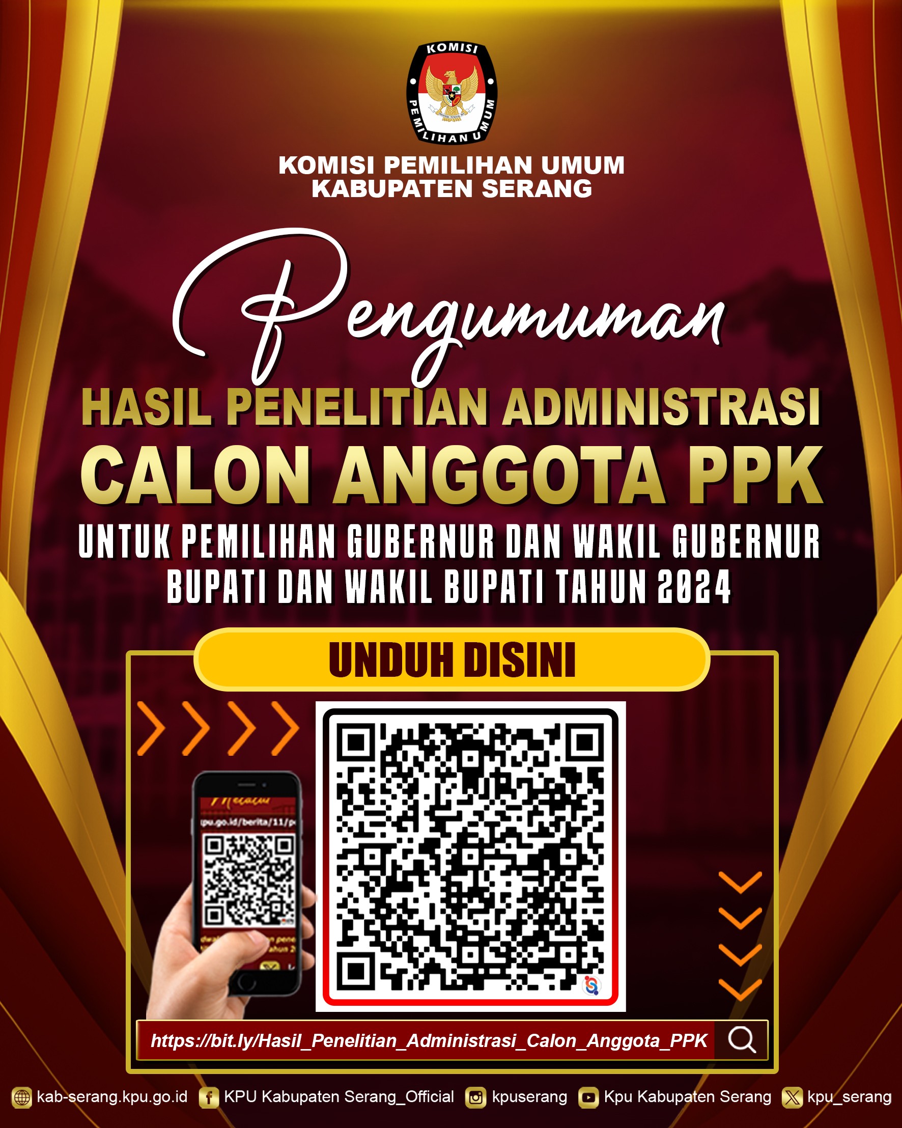Serang, kab-serang.kpu.go.id - Pengumuman Nomor 159/PP.04.1-Pu/3604/2024 tentang Hasil Penelitian Administrasi Calon Anggota Panitia Pemilihan Kecamatan (PPK) untuk Pemilihan Gubernur dan Wakil Gubernur, Bupati dan Wakil Bupati Tahun 2024.