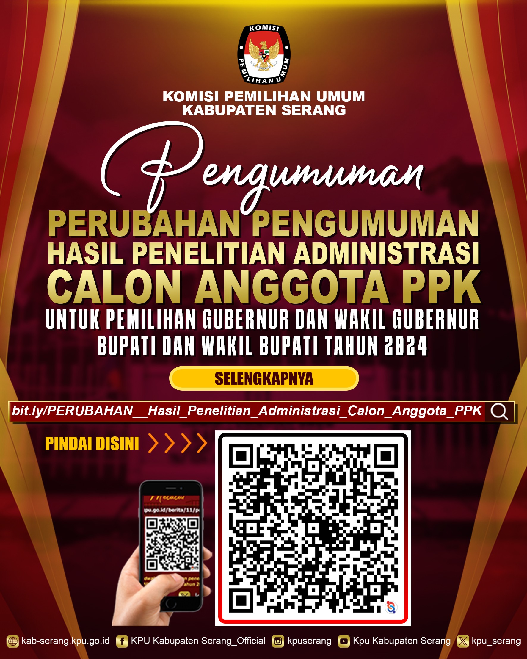 Serang, kab-serang.kpu.go.id - Pengumuman Nomor 162/PP.04.1-Pu/3604/2024 tentang Perubahan Pengumuman Nomor 159/Pp.04.1-Pu/3604/2024 Tentang Hasil Penelitian Administrasi Calon Anggota Panitia Pemilihan Kecamatan (PPK) untuk Pemilihan Gubernur Dan Wakil Gubernur, Bupati Dan Wakil Bupati Tahun 2024