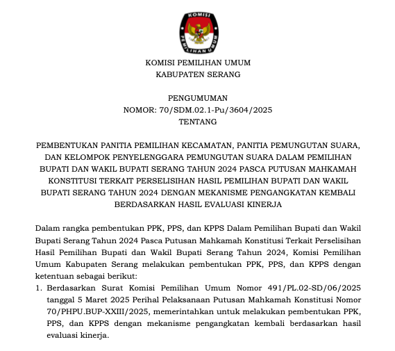 PENGUMUMAN PEMBENTUKAN PANITIA PEMILIHAN KECAMATAN, PANITIA PEMUNGUTAN SUARA, DAN KELOMPOK PENYELENGGARA PEMUNGUTAN SUARA DALAM PEMILIHAN BUPATI DAN WAKIL BUPATI SERANG TAHUN 2024 PASCA PUTUS