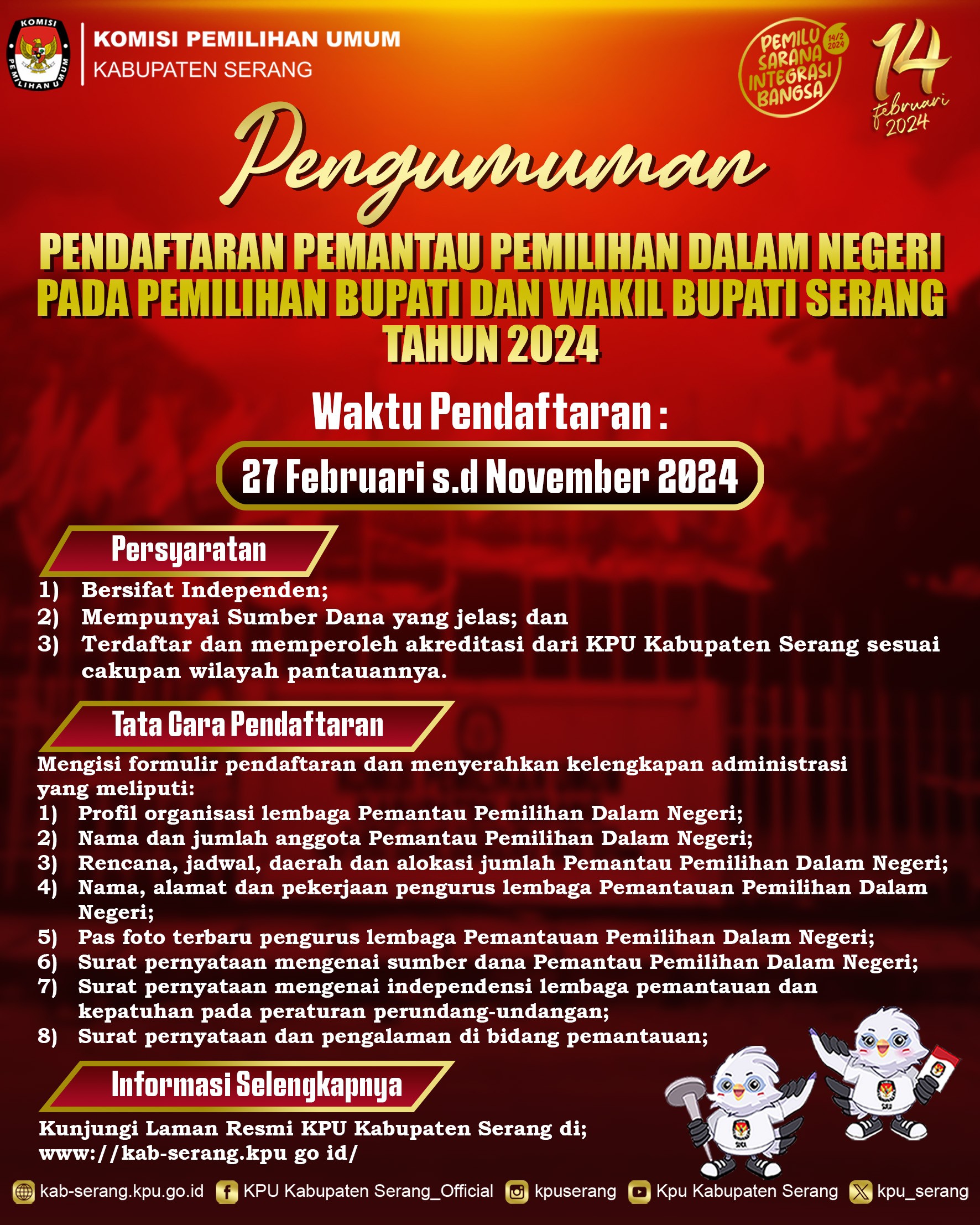 PENGUMUMAN PENDAFTARAN PEMANTAU PEMILIHAN DALAM NEGERI PADA PEMILIHAN BUPATI DAN WAKIL BUPATI SERANG TAHUN 2024