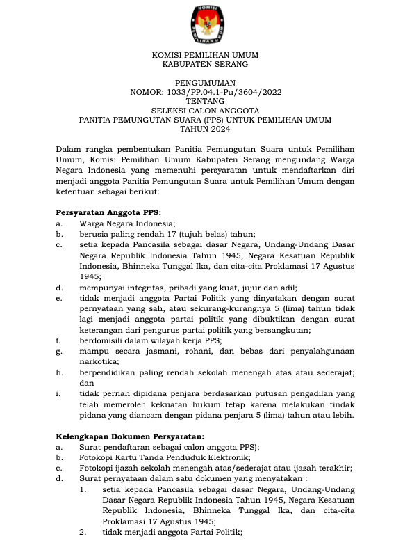 Dalam rangka pembentukan Panitia Pemungutan Suara untuk Pemilihan Umum, Komisi Pemilihan Umum Kabupaten Serang mengundang Warga Negara Indonesia yang memenuhi persyaratan untuk mendaftarkan diri menjadi anggota Panitia Pemungutan Suara untuk Pemilihan Umum dengan ketentuan sebagai berikut: