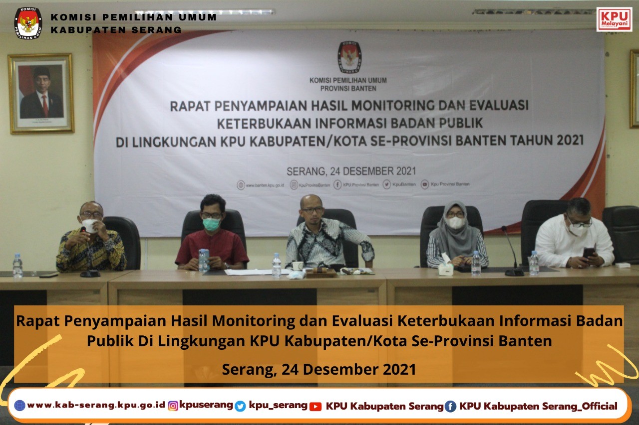 Serang (24/12) - KPU Kabupaten Serang mengikuti Kegiatan Rapat Penyampaian Hasil Monitoring dan Evaluasi Keterbukaan Informasi Badan Publik Di Lingkungan KPU Kabupaten/Kota Se-Provinsi Banten pada Jumat (24/12) di Aula KPU Provinsi Banten. Bapak Eka Satia Laksmana selaku Kordiv Sosdiklih Parmas KPU Provinsi Banten menyampaikan bagaimana pentingnya PPID sebagai jembatan untuk memberikan informasi kepada publik agar terdapat transparansi dan keterbukaan data yang luas dan harus memiliki respon yang baik karena berkaitan dengan pelayanan publik. Selanjutnya beliau menegaskan bahwa PPID tidak berdiri sendiri melainkan kerjasama tim antar divisi yang menjadi tanggung jawab bersama dalam suatu badan publik, sehingga harus tercipta koordinasi yang baik agar penyampaian informasi tidak terhambat.