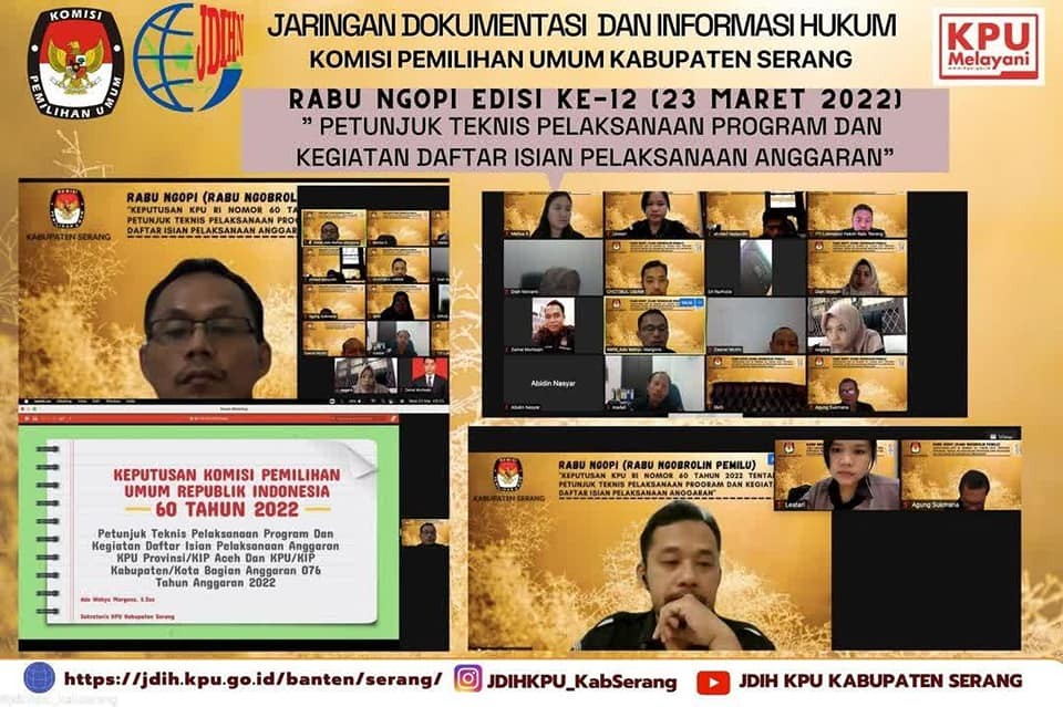 Serang (23/3) - Pada hari Rabu tanggal 23 Maret 2022, KPU Kab Serang Kembali mengadakan acara rutin hari Rabu yaitu Rabu Ngopi dengan Tema “ Keputusan KPU Nomor 60 Tahun 2022 tentang Petunjuk Teknis Pelaksanaan Program dan Kegiatan Daftar Isian Pelaksanaan Anggaran”. Pemantik acara hari ini oleh Bapak Ade Wahyu Margono ( Sekretaris) dan Bapak Chotibul Umam ( Kasubbag Program dan Data). Rabu Ngopi diawali dengan mendengarkan lagu Kebangsaan Indonesia Raya dan Membacakan Pancasila.Acara dibuka oleh Ibu Siti Maryam.
