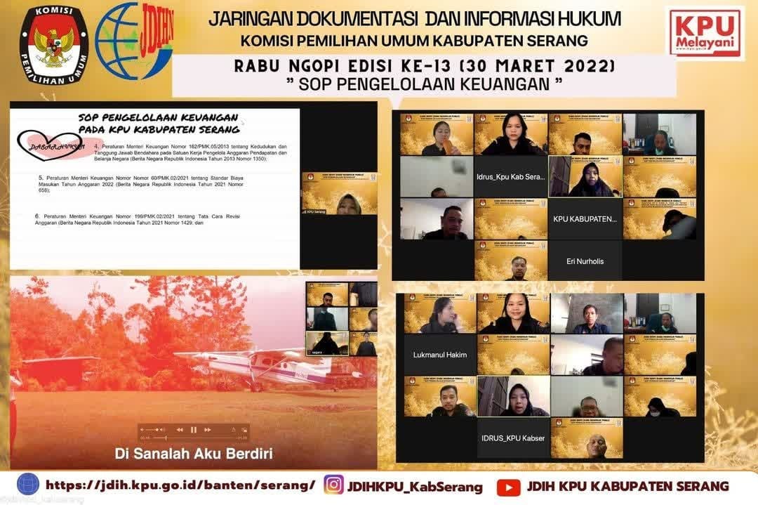 Serang, 30/3 - KPU Kabupaten Serang kembali mengadakan acara rutin mingguan Rabu Ngopi ( Rabu Ngobrolin Pemilu) dengan Tema “Sop Pengelolaan Keuangan Pada KPU Kabupaten Serang “ dengan Pemantik : Ibu DIAH NOVIANTI dan Moderator oleh Ibu Sagara. Acara berlangsung secara daring melalui aplikasi Zoom. Acara dihadiri oleh Ketua dan seluruh Anggota KPU Kab Serang, Sekretaris, Seluruh Kasubbag beserta seluruh Staff Pelaksana di KPU Kab Serang . Acara dibuka oleh Bapak Abidin Nasyar selaku Ketua KPU Kab Serang.