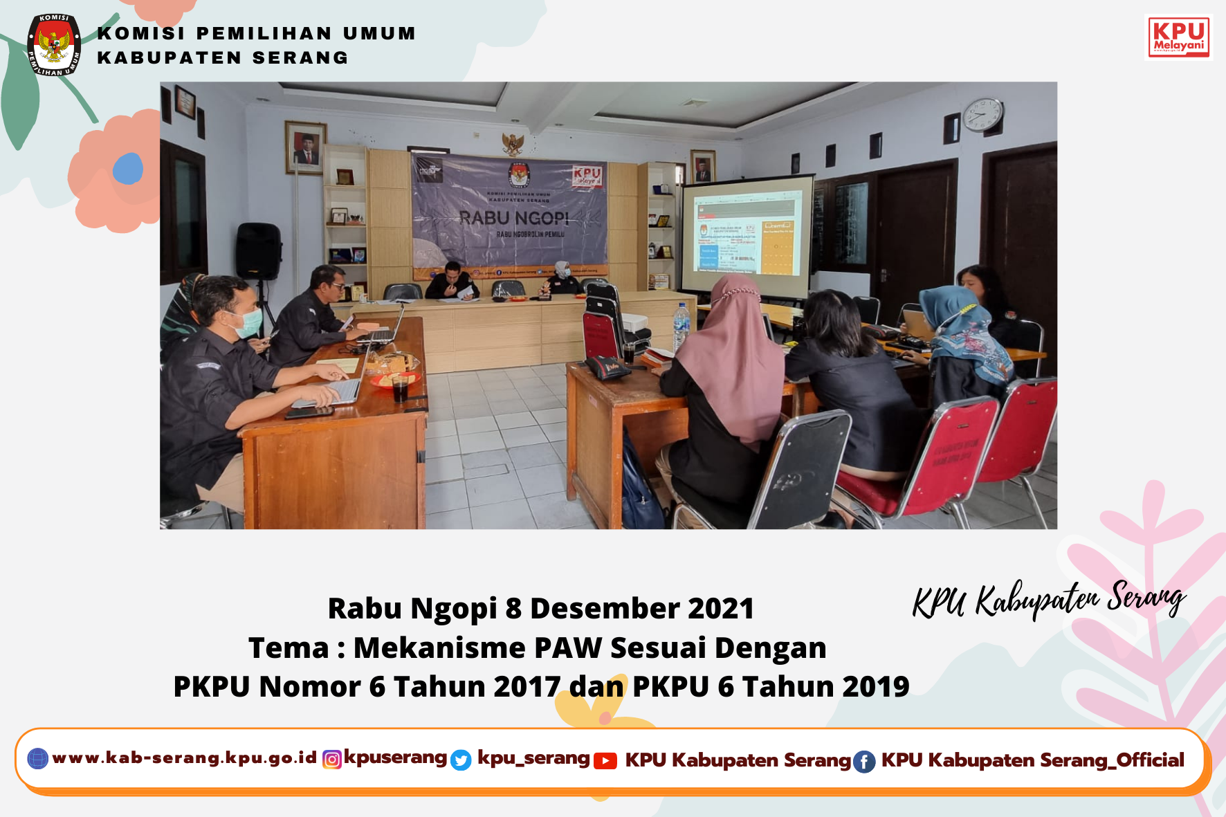 Serang (8/12) Rabu Ngopi sebagai kegiatan rutin KPU Kabupaten Serang kembali dilaksanakan pada Rabu, (8/12) dengan Tema "Mekanisme Pergantian Antar Waktu (PAW) sesuai PKPU No 6 Tahun 2017 dan PKPU Nomor 6 Tahun 2019.