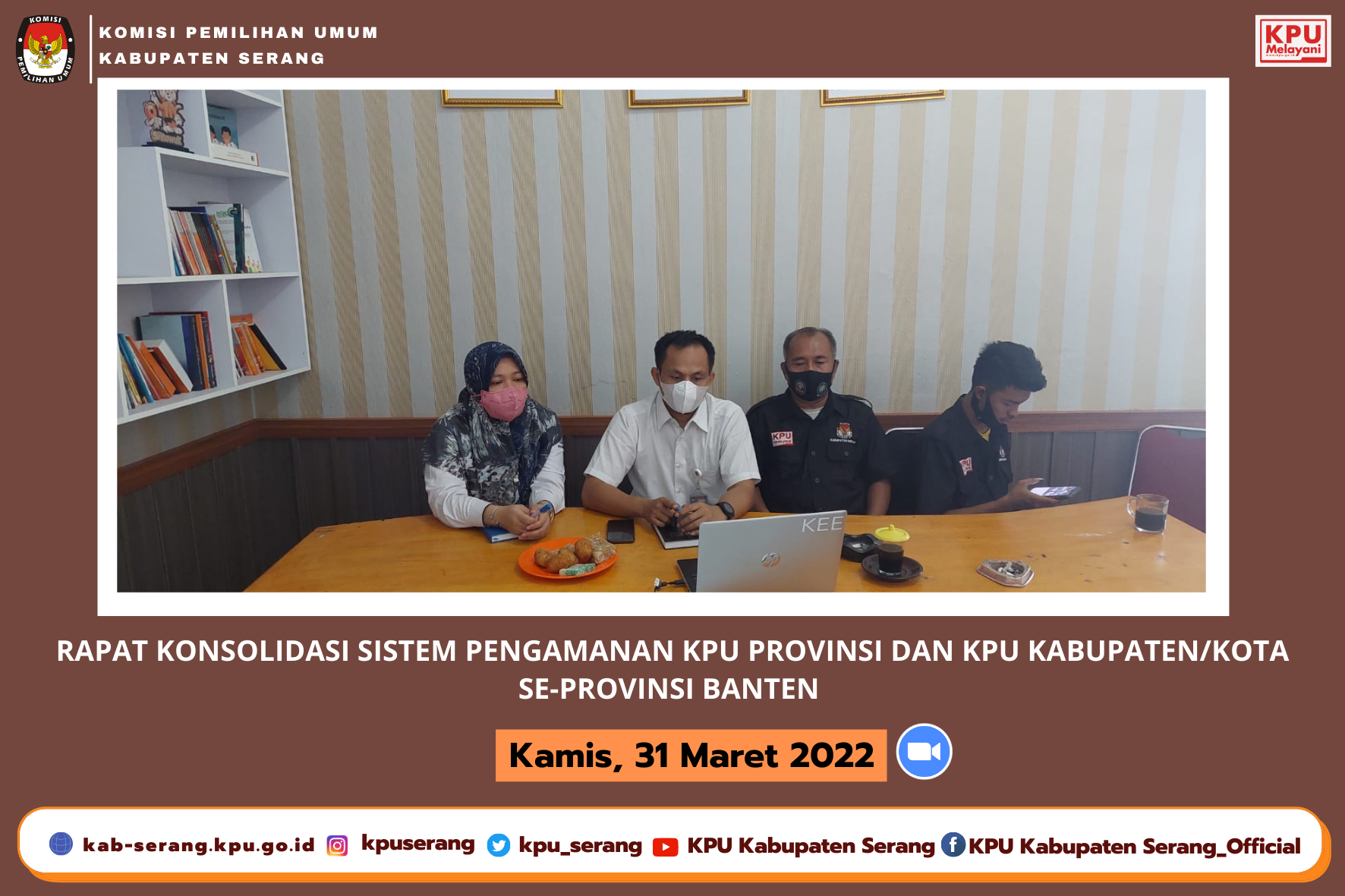 KPU Kabupaten Serang menghadiri undangan Rapat Konsolidasi Sistem Pengamanan KPU Provinsi dan KPU Kabupaten/Kota Se Provinsi Banten melalui zoom meeting pada Kamis (31/3). Agenda ini diikuti oleh Sekretaris KPU Kabupaten Serang (Bapak Ade Wahyu Margono), Kasubag KUL (Ibu Diah Novianti) dan dua Pamdal (Bapak Awaludin dan Bapak Ramdhan). Hadir sebagai Narasumber dari KPU RI Kabag Pamdal Bapak Azhari, Sekretaris KPU Provinsi Banten dan Sekretaris KPU Kab/Kota Se Provinsi Banten serta para Kasubag Keuangan Umum dan Logistik KPU Kab/Kota se provinsi Banten. Bapak Azhari memberikan perhatian penuh kepada para pamdal yg ada di KPU Provinsi dan kpu Kabupaten/Kota di seluruh indonesia dengan jumlah total sebanyak 1.846 orang pamdal yg tersebar di 34 Provinsi.