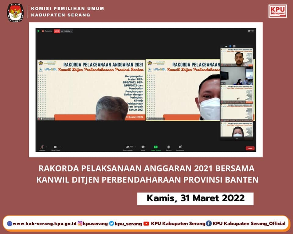 Serang (31/3) - KPU Kabupaten Serang mengikuti Rapat Koordinasi Daerah Pelaksanaan Anggaran Tahun 2022 yang diselenggarakan oleh Kanwil DJPb Provinsi Banten melalui zoom meeting pada hari Kamis, 31 Maret 2022. Hadir sebagai pemateri dari perwakilan Direktorat Pelaksana Anggaran Republik Indonesia Bapak Safaat yang menjelaskan terkait Peraturan Direktorat Jenderal Nomor PER-1/PB/2022 Tentang Petunjuk Teknik Revisi Anggaran Yang Menjadi Kewenangan Direktorat Jenderal Perbendaharaan. Perdirjen Tata Cara Revisi ini merangkum ketentuan yang menjadi kewenangan DJPb untuk membantu stakeholder melaksanakan aturan Revisi Anggaran.