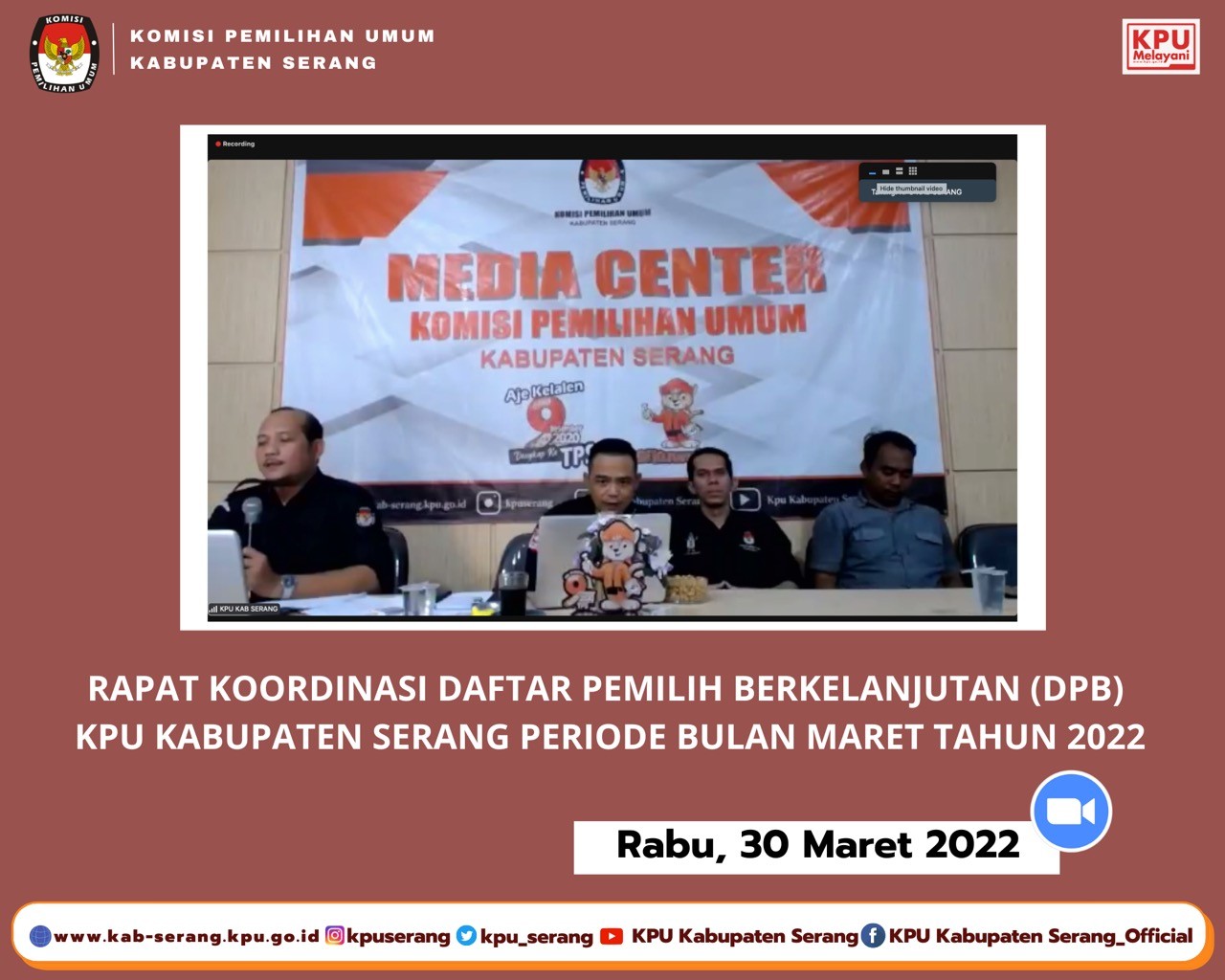 KPU Kabupaten Serang melaksanakan Rapat Koordinasi Daftar Pemilih Berkelanjutan Periode Triwulan Ke- 1 Tahun 2022 secara daring via zoom meeting pada Rabu (30/3) yang berpedoman Peraturan Komisi Pemilihan Umum Republik Indonesia Nomor 6 Tahun 2021 tentang Pemutakhiran Data Pemilih Berkelanjutan dalam Rapat Koordinasi ini ada beberapa hal yang perlu disampaikan :