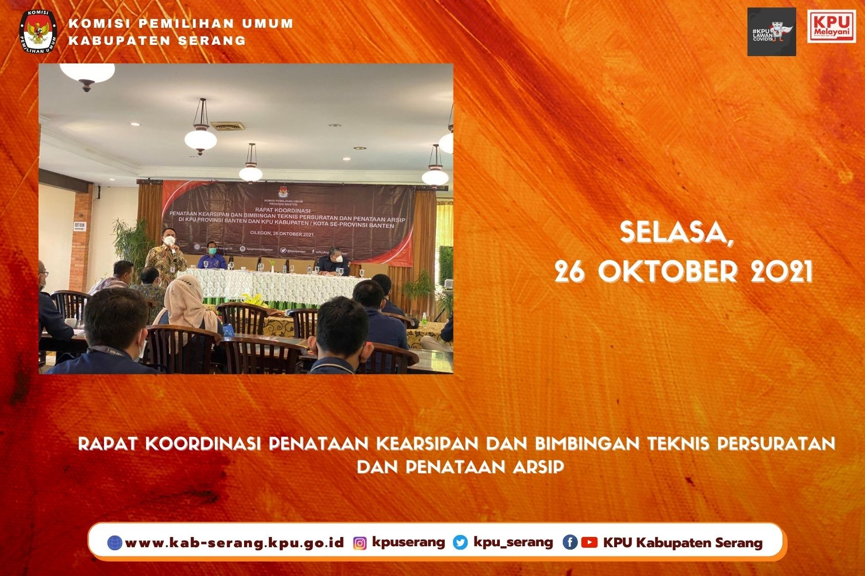 #TemanPemilih KPU Kabupaten Serang yang diwakili oleh Ketua KPU, Sekretaris dan Kasubag KUL mengikuti Rapat Koordinasi Penataan Kearsipan dan Bimbingan Teknis Persuratan dan Penataan Arsip yang diselenggarakan oleh KPU Provinsi Banten pada Selasa (26/10). Kegiatan ini diikuti oleh KPU Kabupaten/Kota se Provinsi Banten.Narasumber mengenai materi penataan kearsipan berasal dari Arsip Nasional Republik Indonesia, dilanjutkan dengan Materi Retensi Arsip Kepegawaian dan Keuangan Serta Tata Kelola Persuratan dari Biro Umum KPU RI. Selanjutnya dilanjutkan dengan diskusi dan tanya jawab yamg dipandu oleh KPU Provinsi Banten. #KPUmelayani
