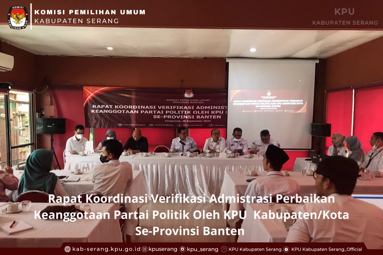 Serang (26/9) - KPU Kabupaten Serang menghadiri undangan KPU Provinsi Banten dalam agenda Rapat Koordinasi Verifikasi Administrasi Perbaikan Keanggotaan Partai Politik Oleh KPU Kabupaten/Kota Se-Provinsi Banten pada Senin (26/9) di Tangerang. Hadir membuka acara, Ketua KPU Provinsi Banten, Wahyul Furqon dan Anggota KPU Provinsi Banten yang turut memberikan arahan.Hadir sebagai pemateri, Masudi selaku Anggota KPU Provinsi Banten yang memaparkan materi persiapan mengenai verifikasi administrasi perbaikan yang akan dimulai pada tanggal 1 Oktober 2022. Selain itu, diberitahukan adanya tambahan menu pada tanggapan masyarakat di aplikasi SIPOL.