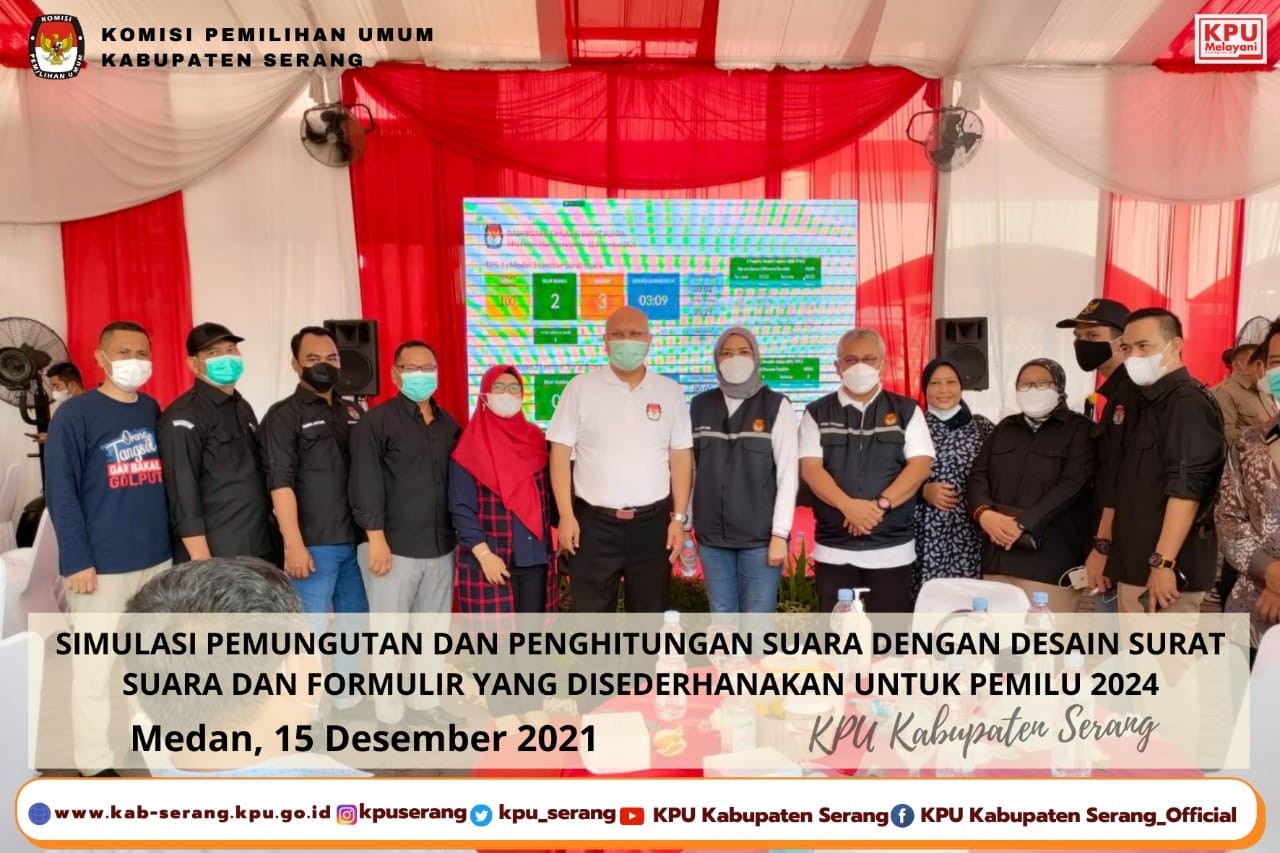 Medan (15/12) - Komisi Pemilihan Umum Republik Indonesia (KPU RI) kembali menggelar Simulasi Pemungutan Suara dengan Desain Surat Suara dan Formulir yang Disederhanakan untuk Pemilu 2024. Kemudian pada kegiatan kali ini, tidak hanya secara daring, KPU Kabupaten Serang juga mengikuti Simulasi Pemungutan Suara dengan Desain Surat Suara dan Formulir yang Disederhanakan untuk Pemilu 2024 secara langsung dari Halaman Kantor KPU Provinsi Sumatera Utara, Medan, Rabu (15/12). Jajaran Pegawai KPU Kabupaten Serang diwakili oleh Ketua dan seluruh Komisioner didamping oleh Komisioner KPU Banten selaku Korwil KPU Kabupaten Serang (Ibu Rohimah). Penerapan Protokol Kesehatan yang ketat tetap diterapkan guna mencegah penyebaran Covid-19.