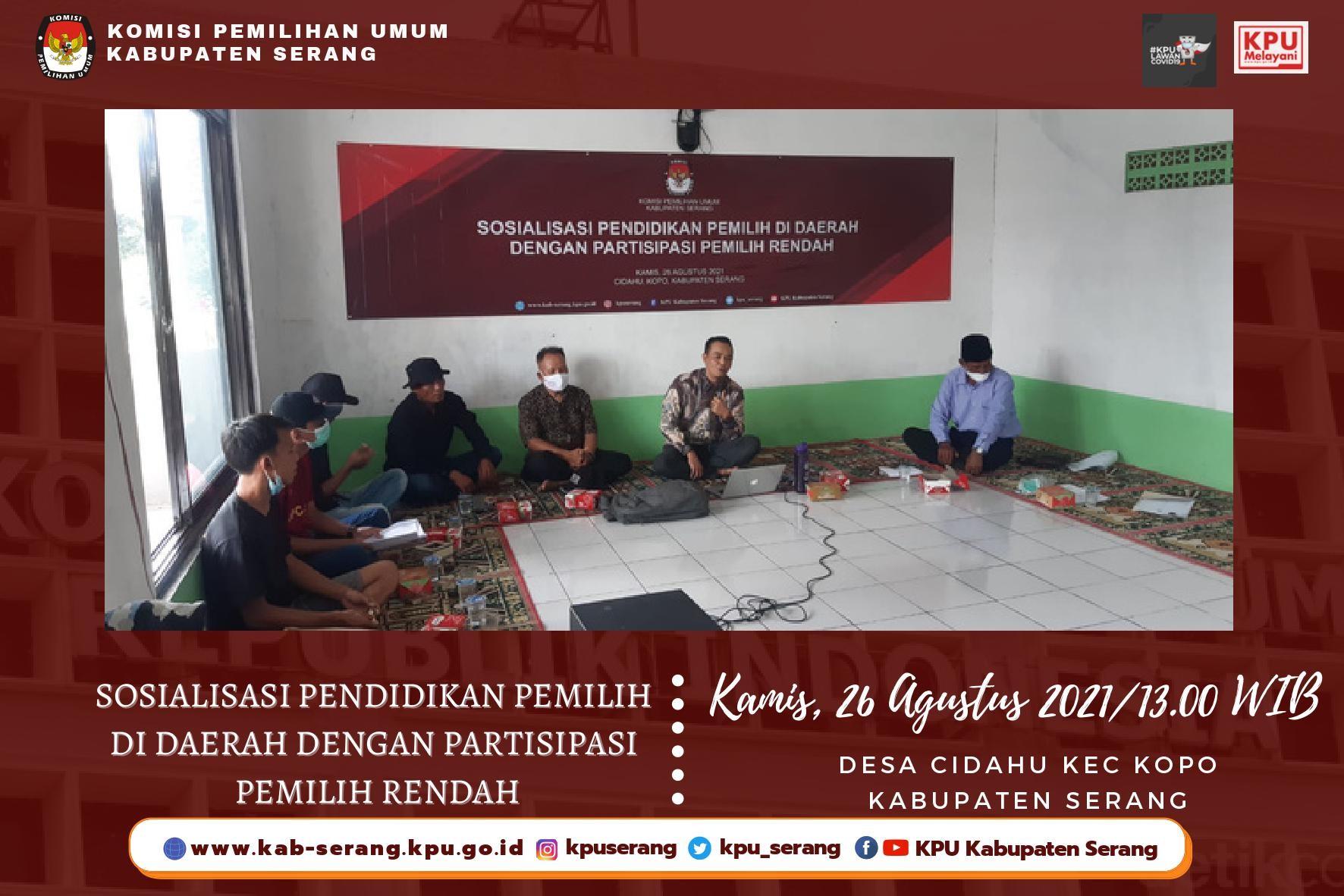 Serang (www.kab-serang.kpu.go.id) – KPU Kabupaten Serang kembali melakukan Sosialisasi Pendidikan Pemilih Di Daerah Dengan Partisipasi Pemilih Rendah Tahun 2021 yang diadakan di Desa Cidahu Kecamatan Kopo pada pukul 13.00 WIB. Hadir sebagai narasumber Bapak Abidin Nasyar (Ketua KPU Kab Serang) dan Bapak H.Abun Abdul Fatah (Tokoh masyarakat).
