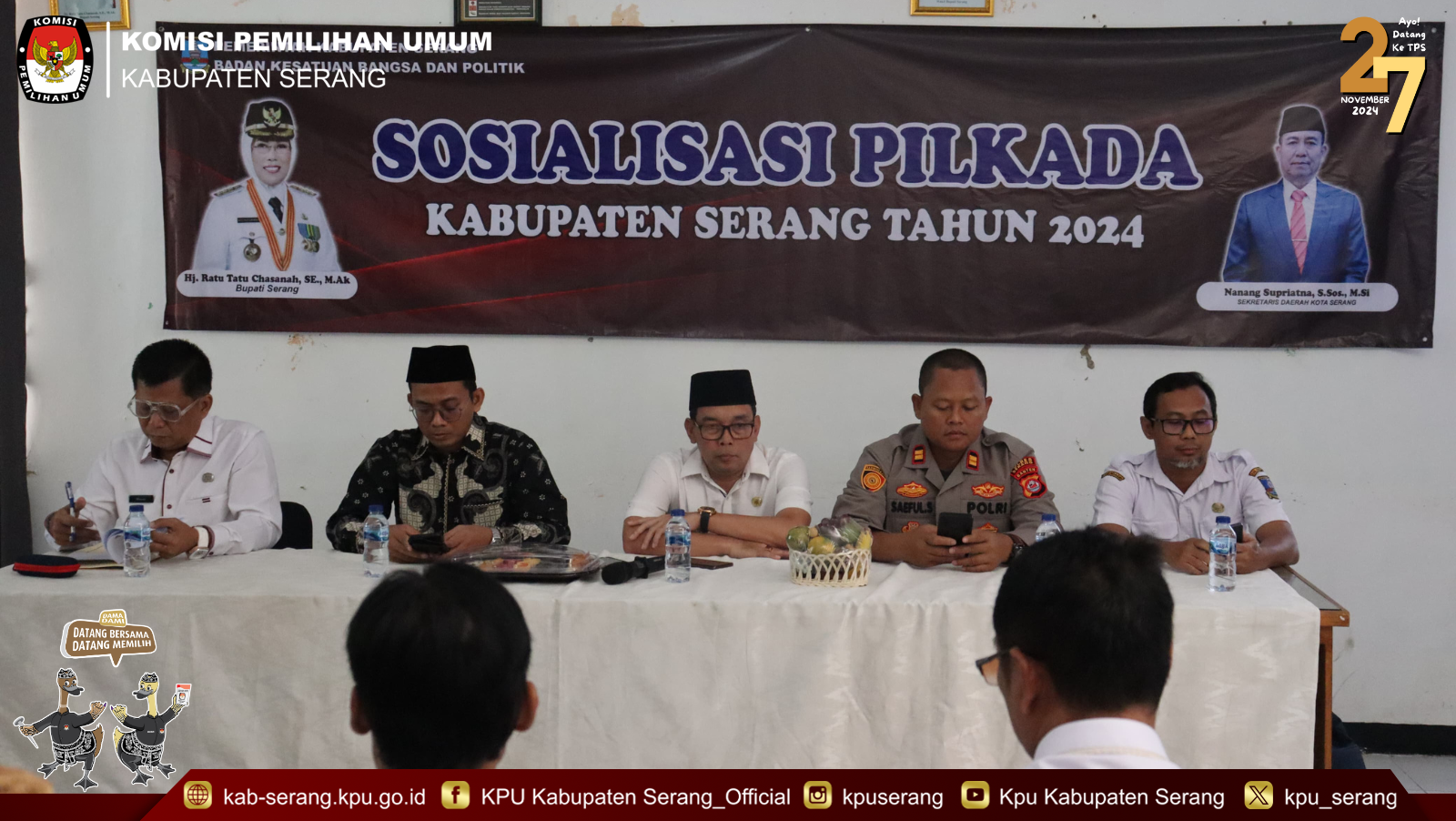 Muhamad Nasehudin menyampaikan Pilkada Tahun 2024 dilaksanakan pada Tanggal 27 November 2024 secara serentak se-Indonesia termasuk di Kabupaten Serang dan Provinsi Banten, dalam hal pelaksanaan penyelenggaraan Pilkada di Kabupaten Serang KPU dibantu Badan Adhoc di tiap kecamatan dan desa termasuk pada saat hari pemungutan suara nanti KPU akan membentuk KPPS untuk ditugaskan di TPS, semoga melalui kegiatan sosialisasi ini dapat meningkatkan partisipasi masyarakat untuk terlibat menjadi penyelenggara di tingkatan TPS.