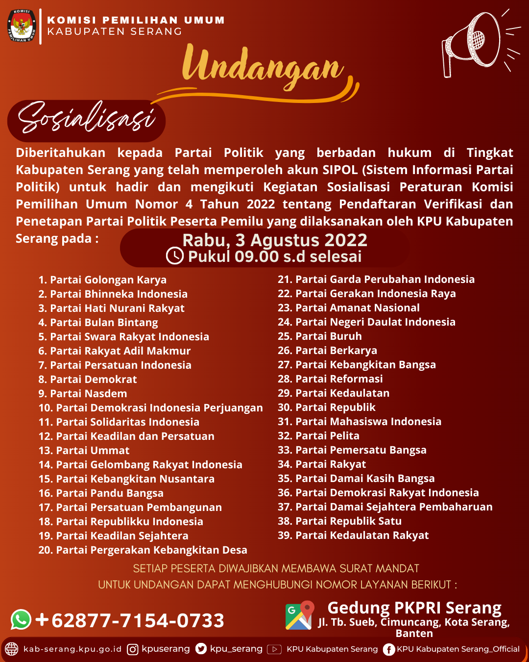 Serang (1/8) - Berikut ini Kami sampaikan Undangan Sosialisasi Peraturan KPU Nomor 4 Tahun 2022 Kepada Partai Politik di tingkat wilayah Kabupaten Serang yang akan dilaksanakan pada Rabu, 3 Agustus 2022 di Gedung PKPRI Serang