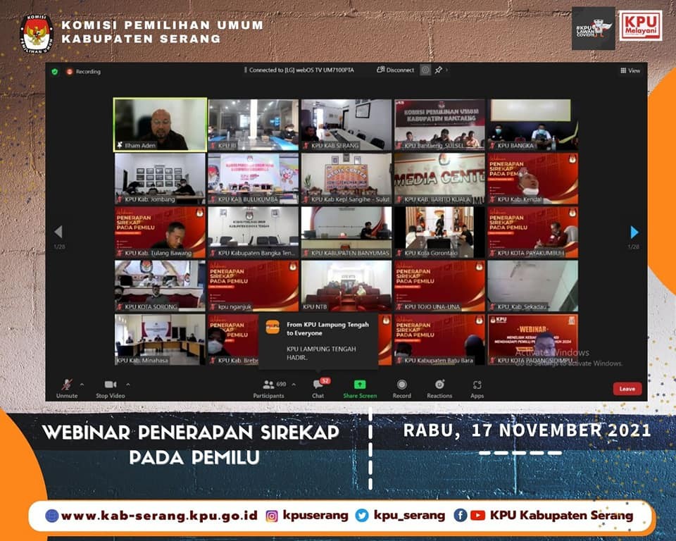 Serang (www.kab-serang.kpu.go.id) - KPU Kabupaten Serang mengikuti Webinar Penerapan Sirekap Pada Pemilu yang diselenggarakan oleh KPU RI secara daring melalui zoom meeting. Kegiatan ini dilakukan sebagai upaya penguatan kapasitas kepemiluan di Indonesia.