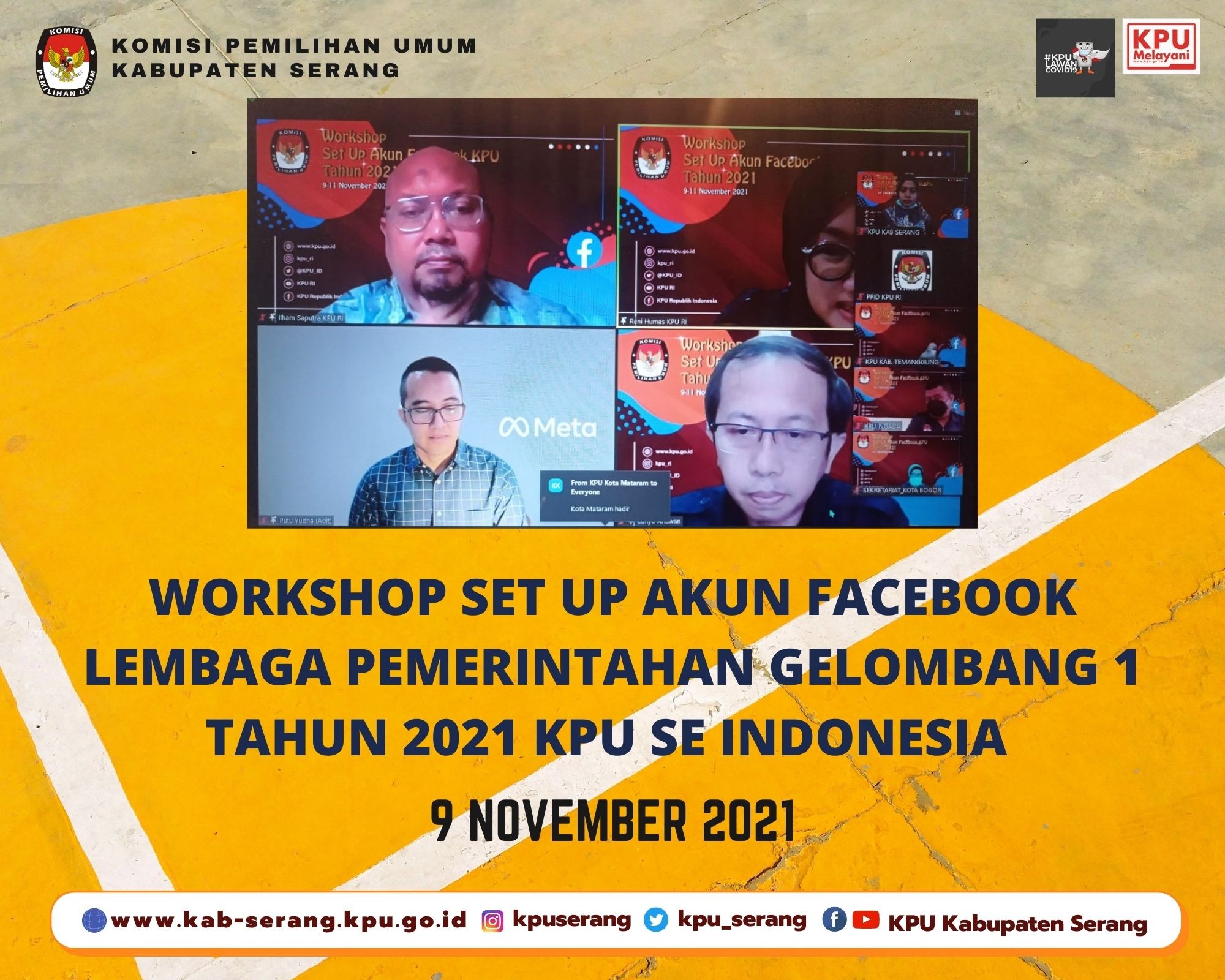 Serang, (www.kab-serang.kpu.go.id) KPU Kabupaten Serang pada Selasa, 9 November 2021 mengikuti Kegiatan Workshop Set Up Akun Facebook Lembaga Pemerintah Gelombang 1 Tahun 2021 bersama KPU Se Indonesia. Kegiatan ini dilakukan secara daring melalui zoom meeting pada Pukul 10.00 WIB. Hadir sebagai narasumber yaitu Bapak Putu Swaditya Yudha selaku Manajer Kemitraan, Lembaga dan Pemerintah Facebook Indonesia. Pada acara ini diberikan materi mengenai bagaimana cara membuat dan mengelola Akun Facebook Lembaga Pemerintahan yang baik.